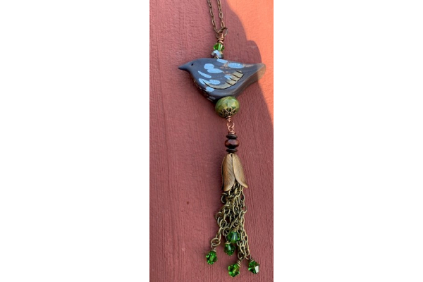 A unique design by Mosaic Art Studio using a beautiful polymer clay bird by Humblebeads in Blue, adorned with a chain tassel, Swarovski crystal and Czech glass beads.
