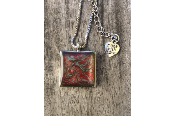 Hand-painted pendant in red and turquoise. The pendant is covered in a clear layer of resin to enhance the colors and for protection.