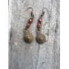 Handpainted earrings with special paints which create unique special effects. The painted part is covered in a clear layer of resin to enhance the colors and for protection. Completed with wood and glass beads
